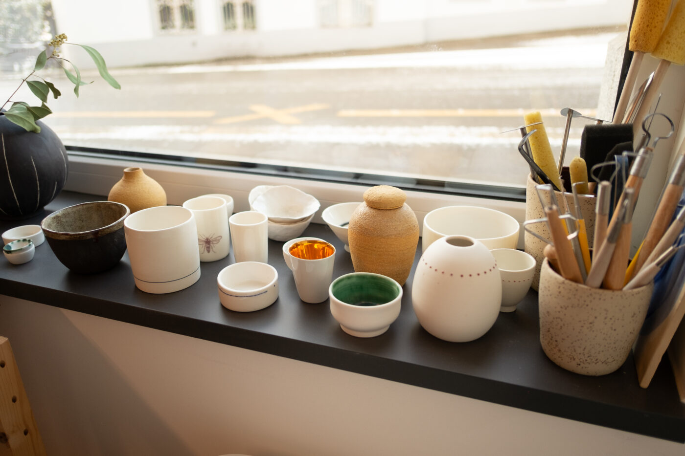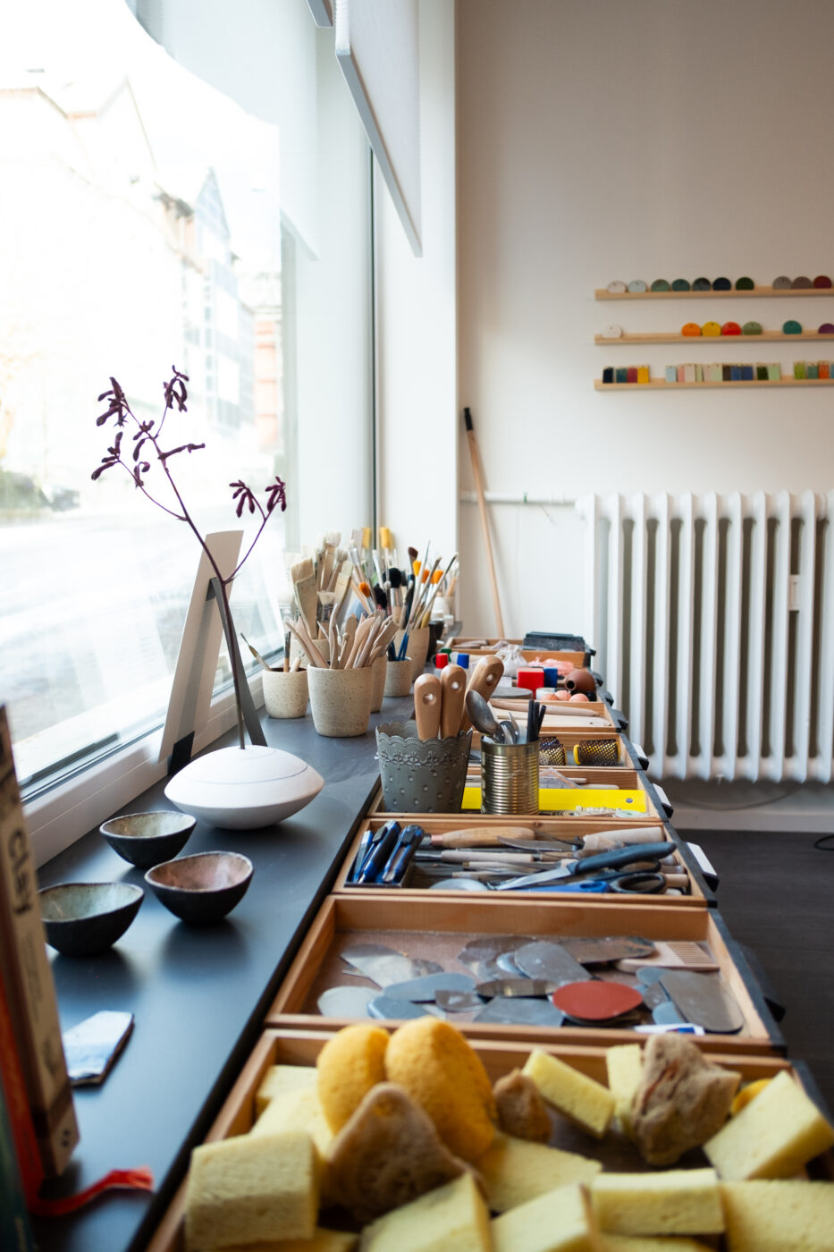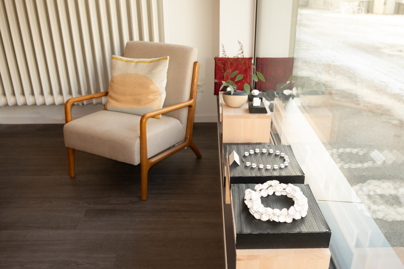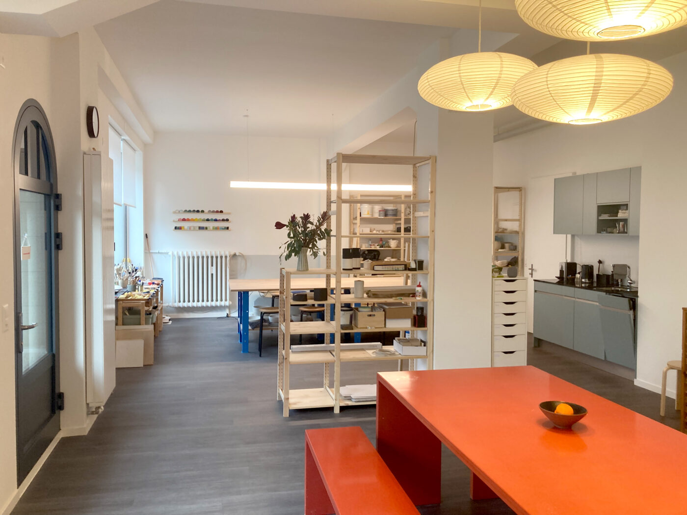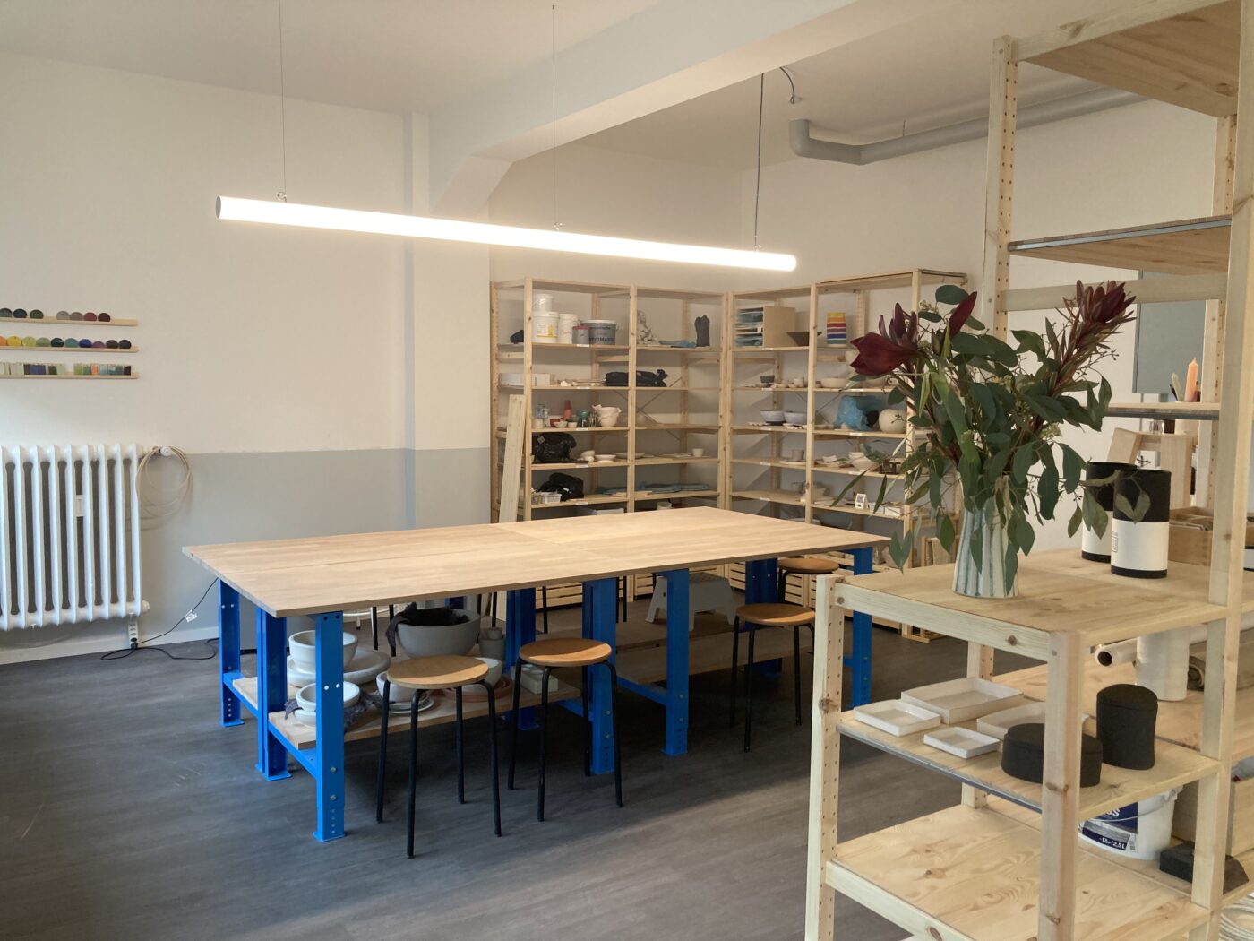 Der Raum ist in zwei Bereiche gegliedert: Im Teil „Keramik“ laden grosszügige Werktische sowie eine elektrische Drehscheibe zum Gestalten und Experimentieren ein. Der Bereich „+ mehr“ bietet Platz für weitere Kreativ-Workshops, Begegnungen und kleine Events. Eine gemütliche Kaffee-Ecke mit Sessel und kleiner Bibliothek rundet die Atmosphäre ab und lädt zum Verweilen ein.