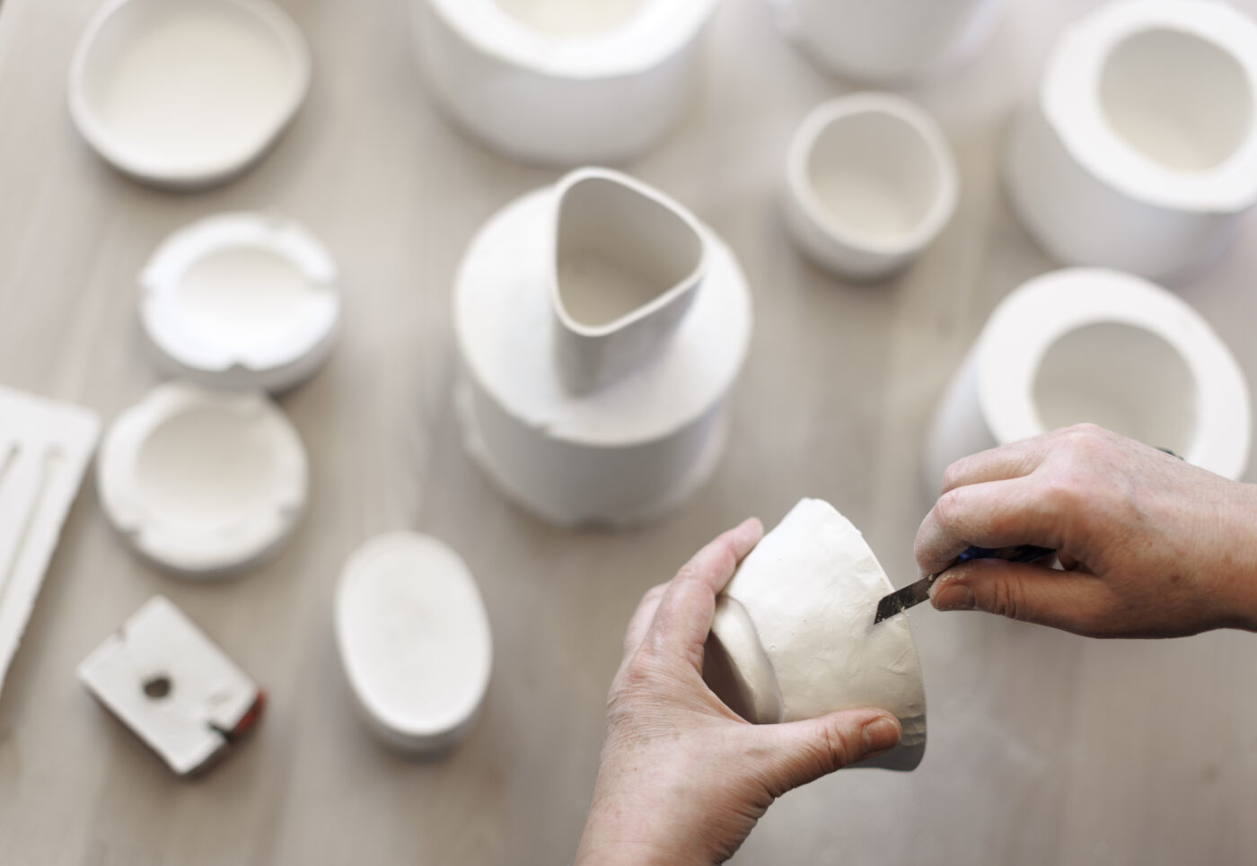 Die Kurse „Gipsformen herstellen und Porzellan giessen“ beinhalten das Entwerfen, Skizzieren und Gestalten von Positivformen (Figur, Tasse, Schale etc.) aus Ton und dessen Abformung mit Gips. Je nach Hinterschneidung des Positivs, wird für den anschliessenden Guss mit Porzellangiessmasse eine ein- oder zweiteilige Giessform benötigt. Die so entstandenen Gips-Negative dienen als Reproduktionsformen für Kleinserien. Das gegossene Porzellangefäss wird nach dem Rohbrand glasiert und kann mit einem Farbdekor versehen werden.